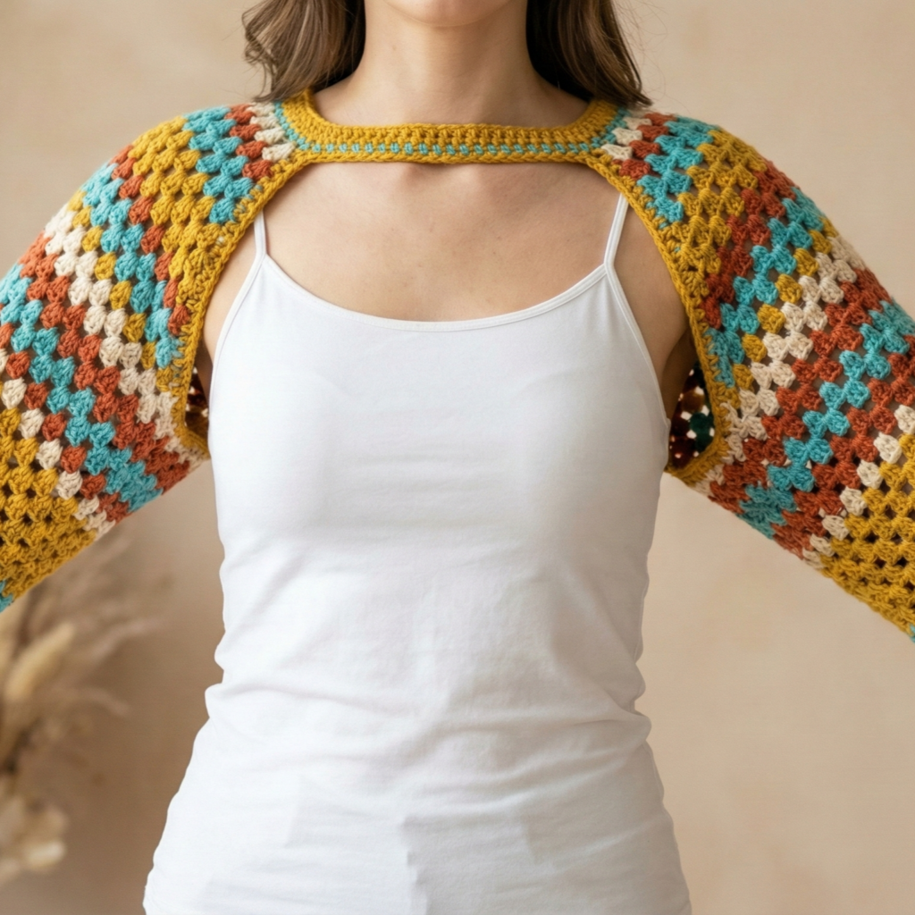 Skill level: Confident beginner. Works well in worsted or aran yarn; classic granny clusters give a boho-chic bolero. This version is written top-down raglan so you can try it on as you go.