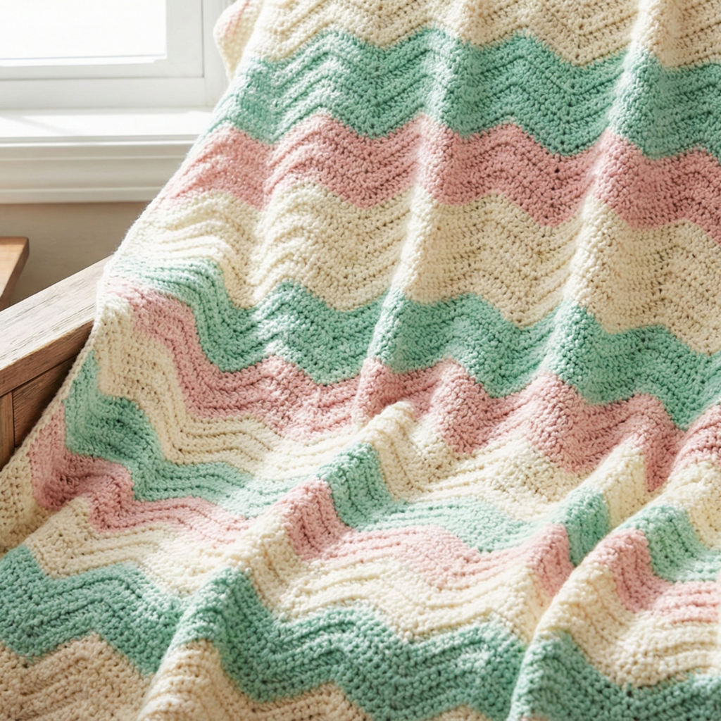 Look & use: classic wavy lines (chevrons) using increases and decreases. Staples for afghans, scarves, and baby blankets — the ripple is arguably the most iconic beginner-friendly textured stitch.