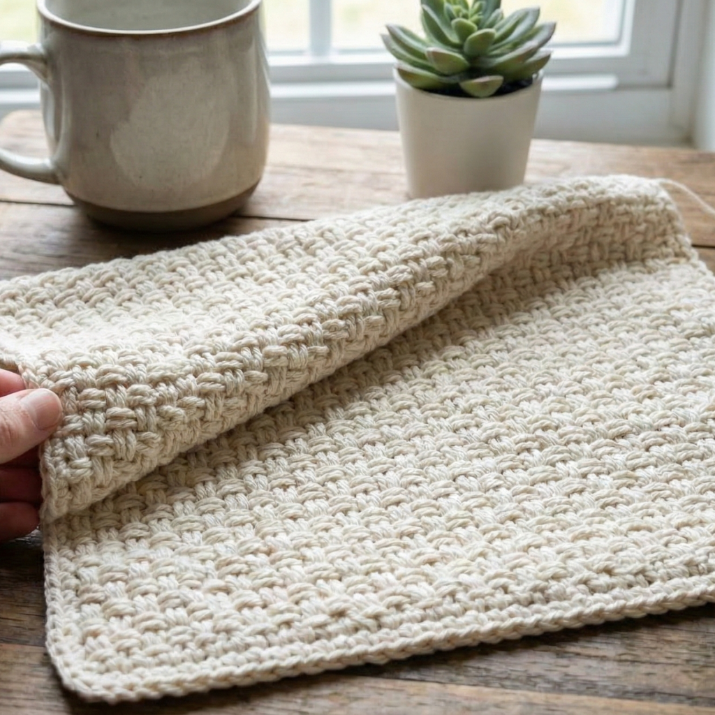 Look & use: small, woven texture that looks like tiny tiles — flat, reversible and extremely useful as a fabric base for garments, washcloths, dishcloths, scarves and warm layers. It’s one of the most versatile basic textures.