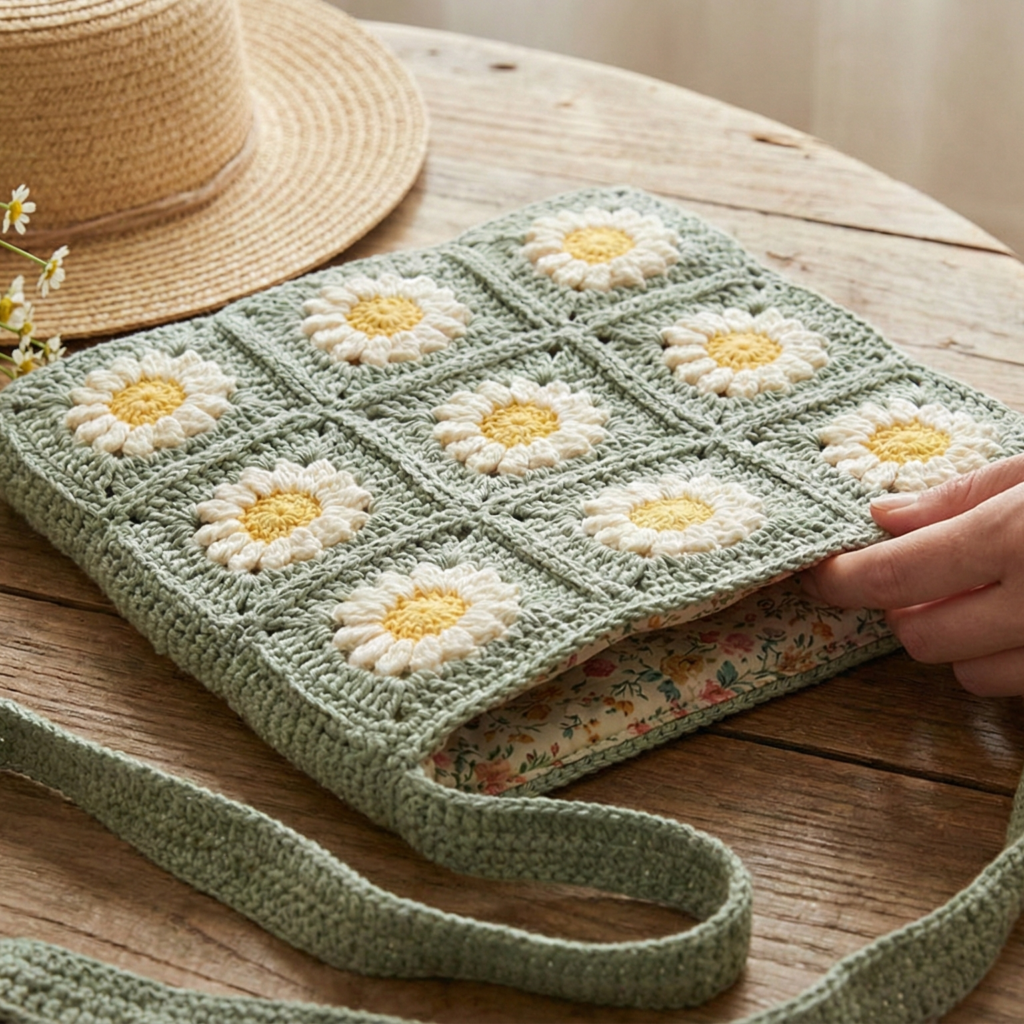 Vibe: sweet granny squares with daisy centers — retro meets cottagecore.