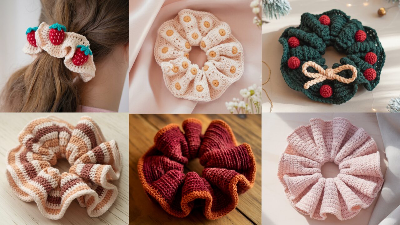 These six scrunchie patterns give you a wide range of looks — from playful strawberries and festive wreaths to soft floral clusters and classic daisies. Each pattern is intentionally flexible: change yarn weight, hook size, or motif count to tune the look from delicate to dramatic. Scrunchies are fast and forgiving projects, ideal for using up yarn scraps or creating thoughtful handmade gifts.