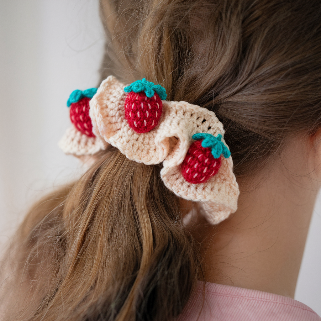 - Attach berries & bow: Sew berries into small clusters across the scrunchie. For a bow, crochet a small rectangle, pinch the center, and wrap with a thin gold band; sew to scrunchie or make removable with a small snap.