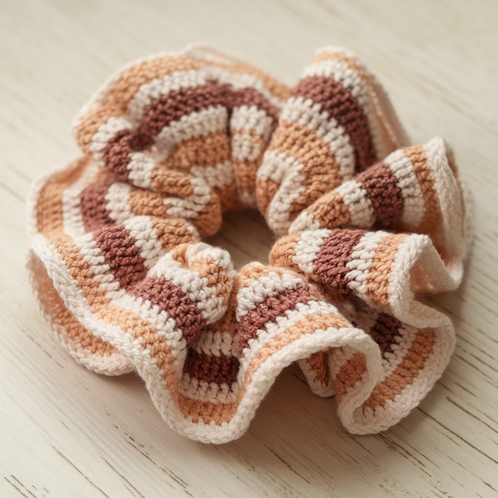 A wide, ruffled scrunchie with boho stripes—textured, soft, and with a gentle vintage vibe. The ruffle is created by working taller stitches at the outer rounds for a full, airy frill.