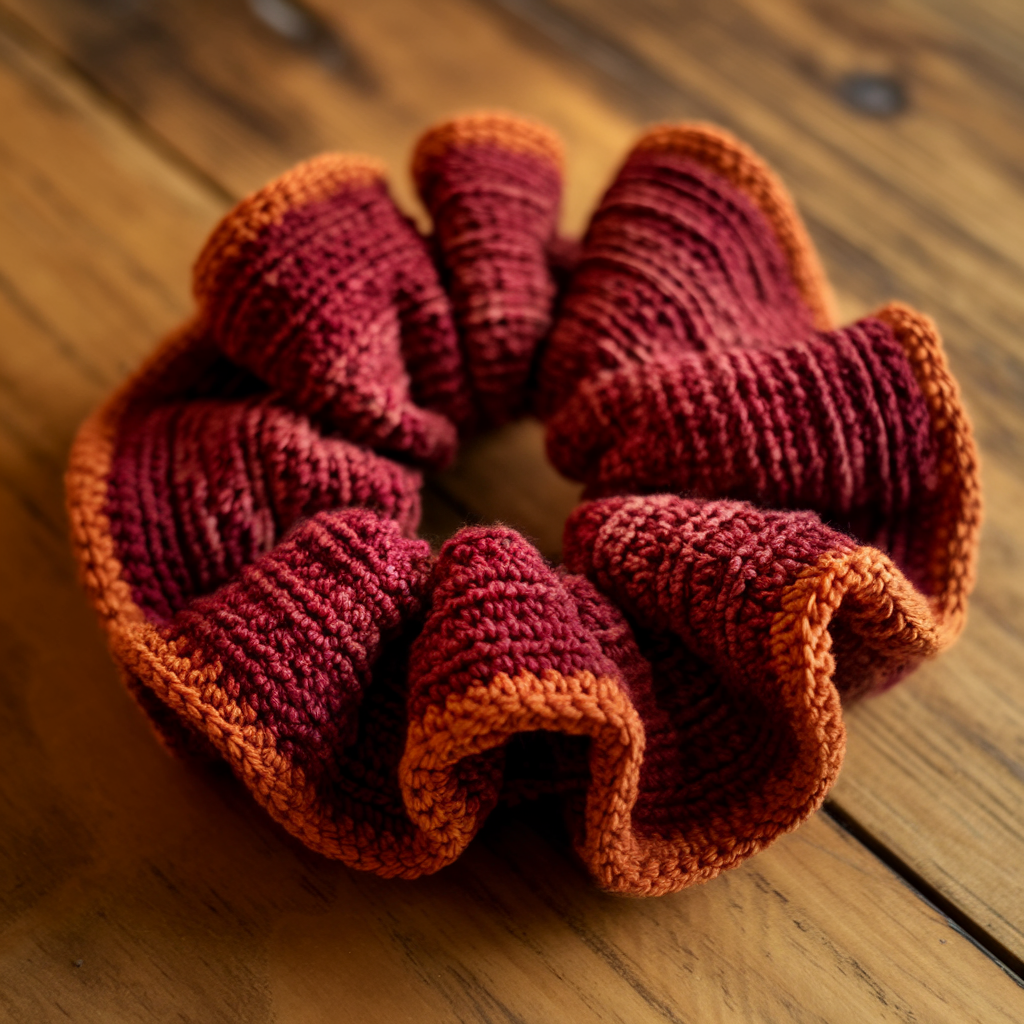 A warm, rustic scrunchie using red and rust tones—perfect for autumn wardrobes. Texture is key here: consider a slightly chunkier yarn and use a stitch that gives subtle ridges.