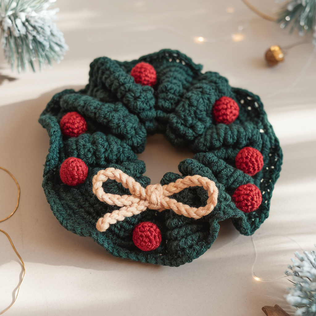 A festive scrunchie inspired by wreaths—worked in deep evergreen with tiny red bobbles (berries) and an optional tiny bow. It’s a subtle holiday accessory that’s wearable beyond the season if you use muted tones.