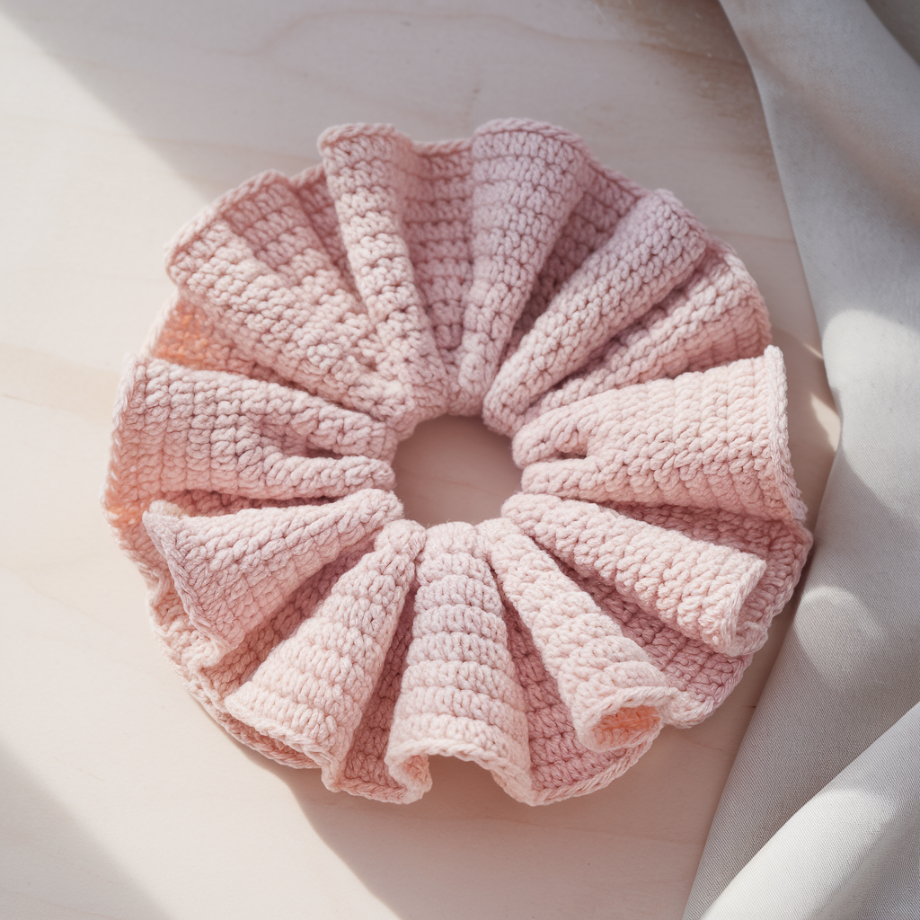 - Make the base band: Crochet tube or rectangle and seam to form the scrunchie base (3–4 rounds of sc/hdc).