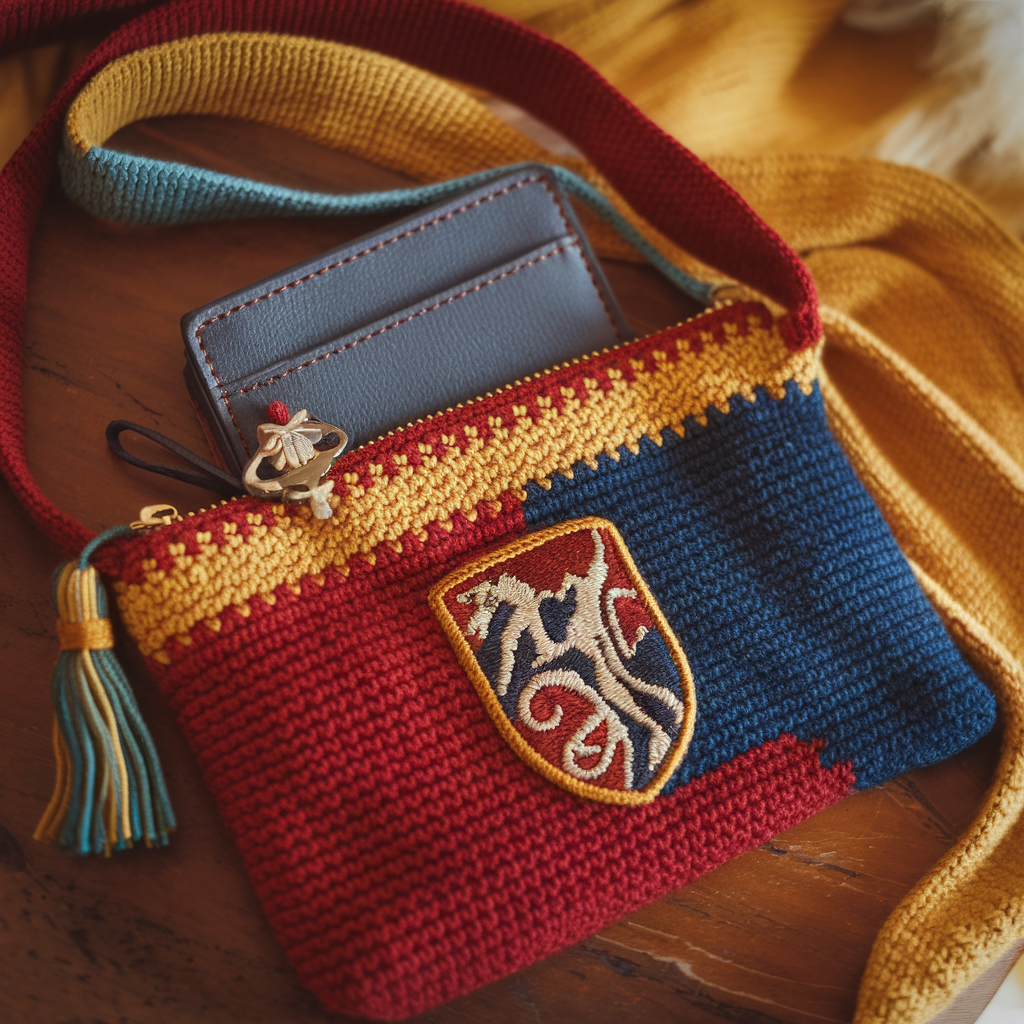 A small purse with house-accent colors, scarf-like tassel, and a subtle crest motif (house-appropriate). I’ll give house-neutral guidance — pick your yarn to nod to a house.