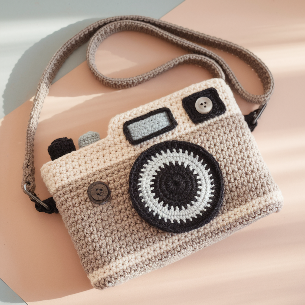 Materials: worsted cotton (~200 yds), 5.0 mm hook, 8–12″ zipper (or magnetic snap), tapestry needle, small amount black/gray/white for lens appliqué, 1″ cotton webbing 20–45″ for strap reinforcement or optional metal chain for styling.