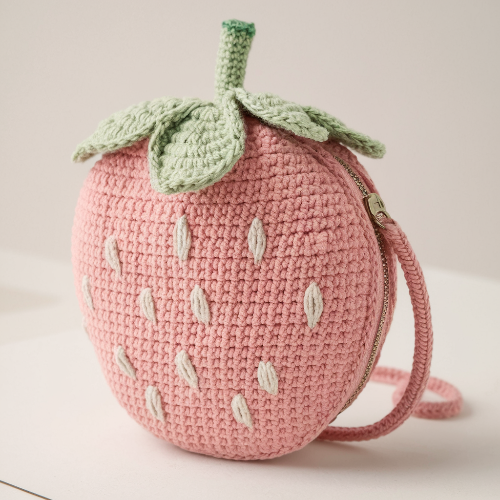 Materials: pastel red worsted, green for leaves, ivory for seeds (tiny sl st/seed beads optional), 4.5–5.0 mm hook, zipper or drawstring top, lining.