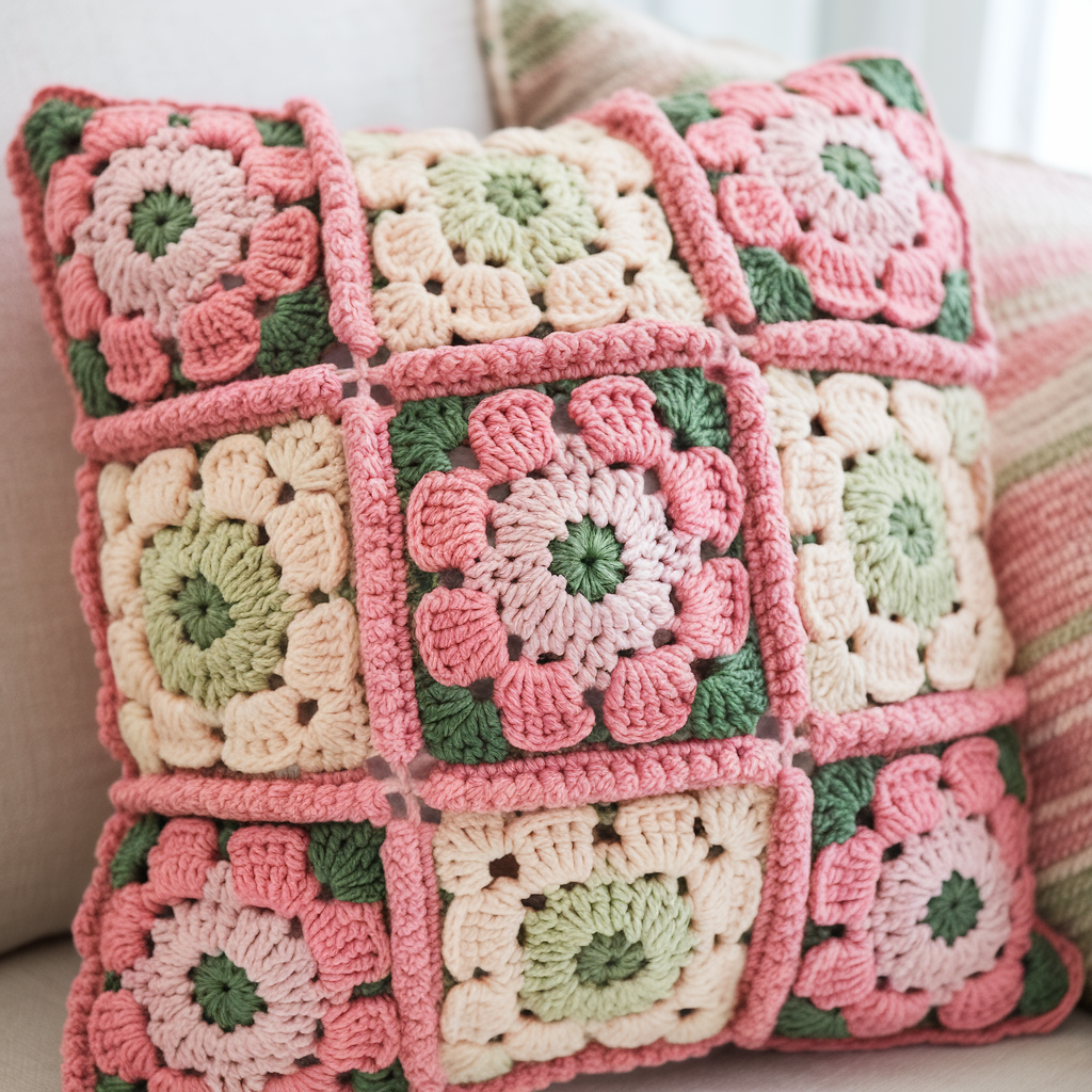 Look & feel: A panel of in-bloom granny/flower motifs assembled into one square — charming, garden-inspired statement pillow.