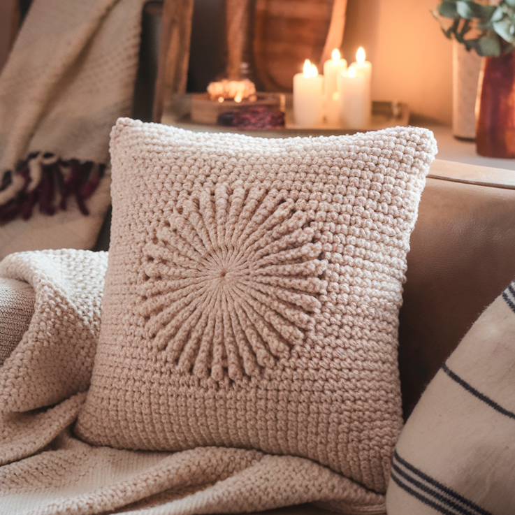 Look & feel: Deep, squishy textured “burst” or starburst motif in the center with a softly rounded, cozy surface — very hygge and perfect for living rooms or reading nooks.
