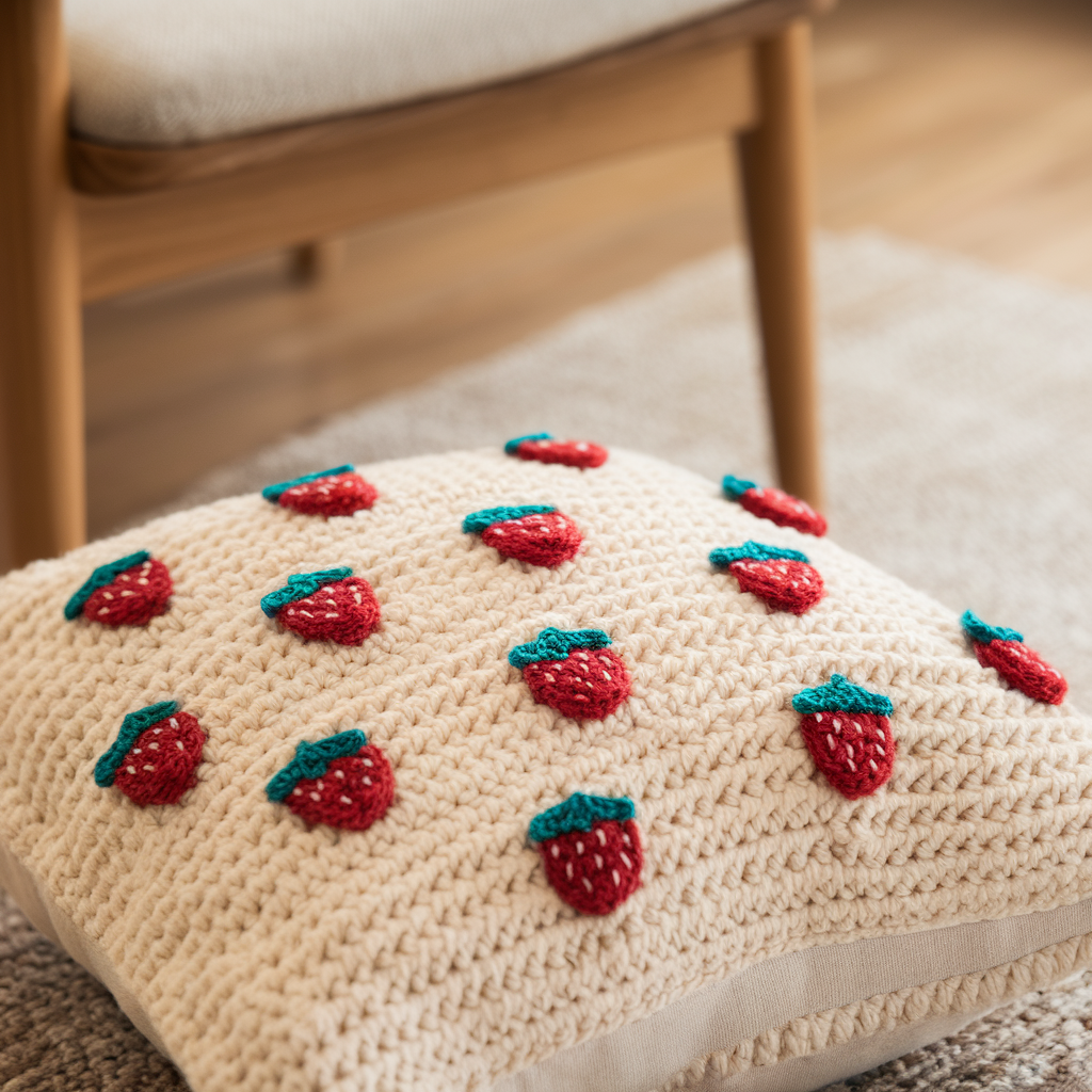 6. Work a solid background square in single color (e.g., cream) to match finished pillow size. Pin strawberries to desired arrangement and sew them flat using the long tails or tapestry needle. For durability, stitch through both motif base and pillow fabric with small tight stitches.
