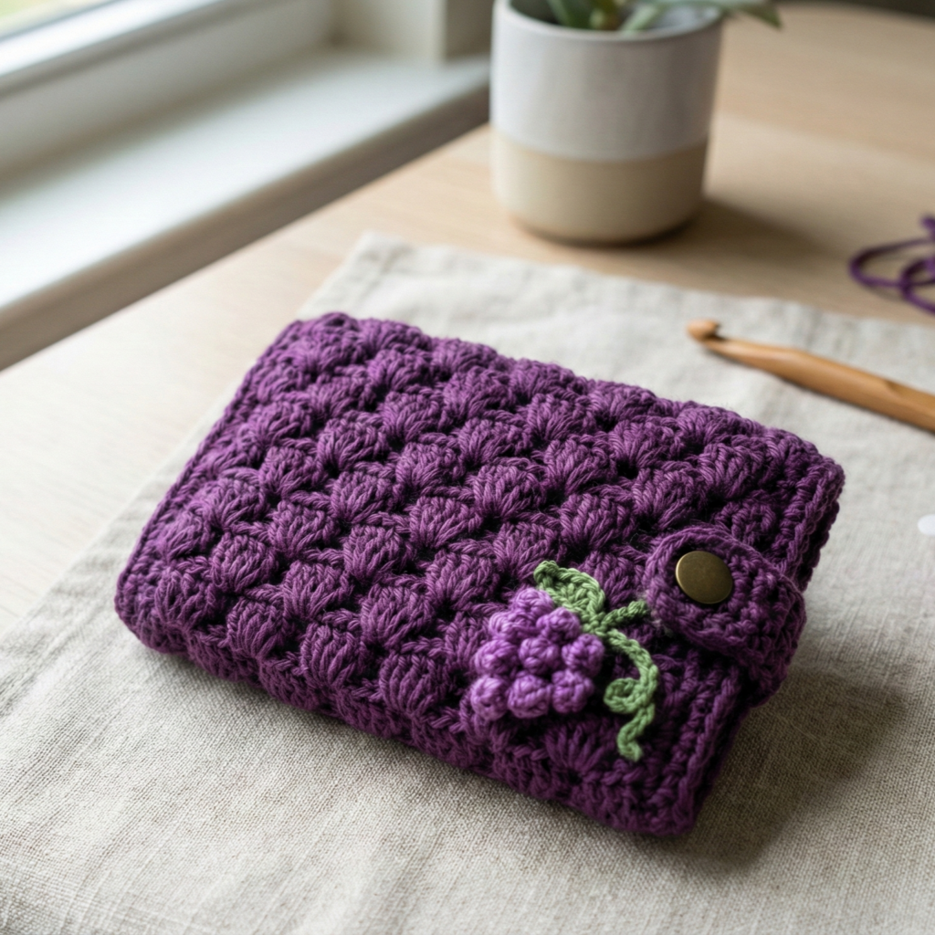 - Add small grape-style bead cluster appliqué in one corner: crochet 5 tiny popcorns and sew them as grapes + tiny leaf.