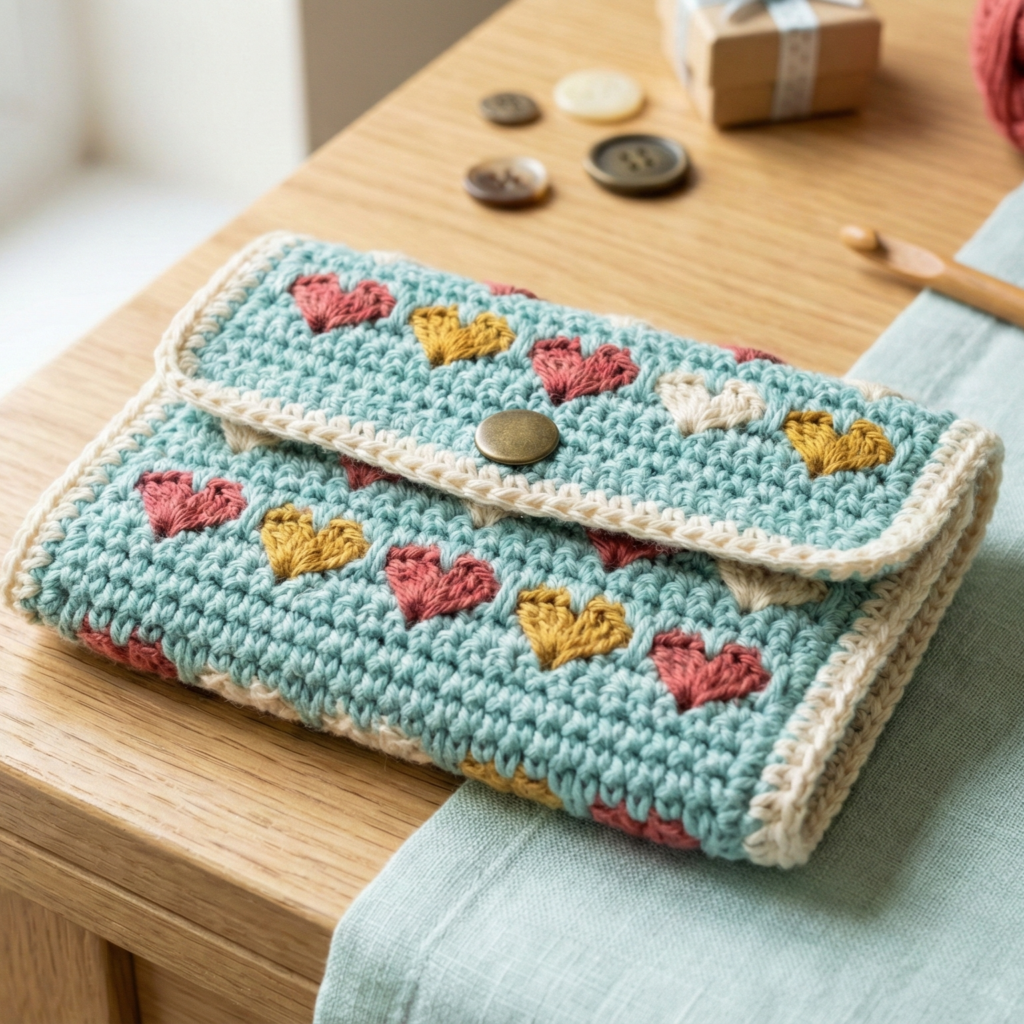 Option 2 — Make applique hearts: Crochet small heart motifs (MR, ch3, 3 dc in ring, ch1, sl st etc. or small hearts patterns available), then sew them onto a plain wallet base. This is simpler and avoids color-carry inside.