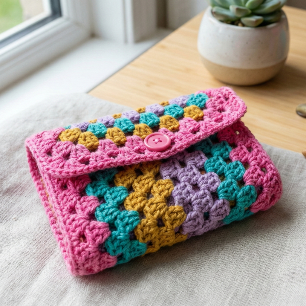 - Motif assembly — granny squares or hex motifs joined together for a patchwork wallet; fun and decorative.