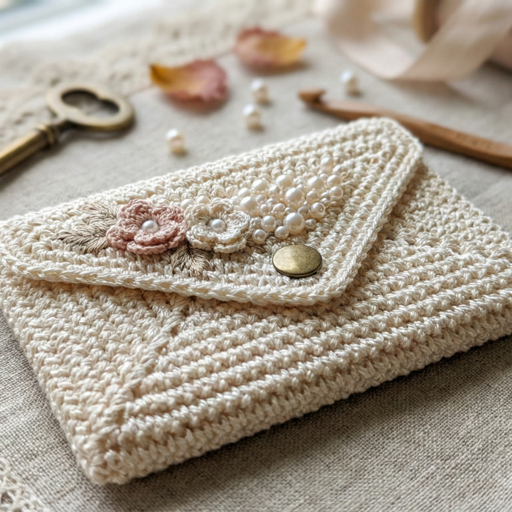 - Embellished applique — crochet a plain wallet base and add flowers, cherries, beads, or embroidery.
