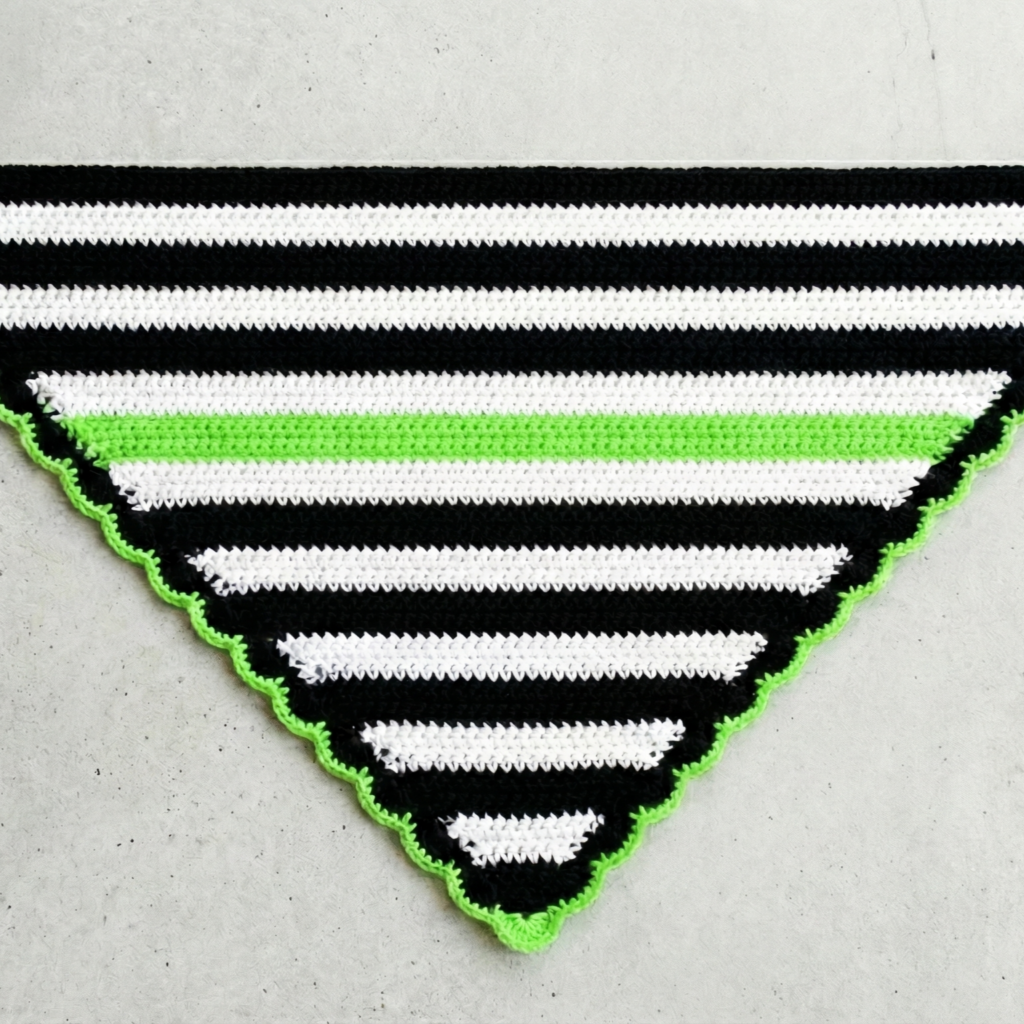 Work a triangular bandana in rows of single or half-double crochet with bold stripes: alternate black and white stripes (2–4 rows per stripe) and an accent stripe along the bottom edge or center line. Crisp color changes are achieved by changing color in last yarn over of previous stitch so the new color starts the next stitch.