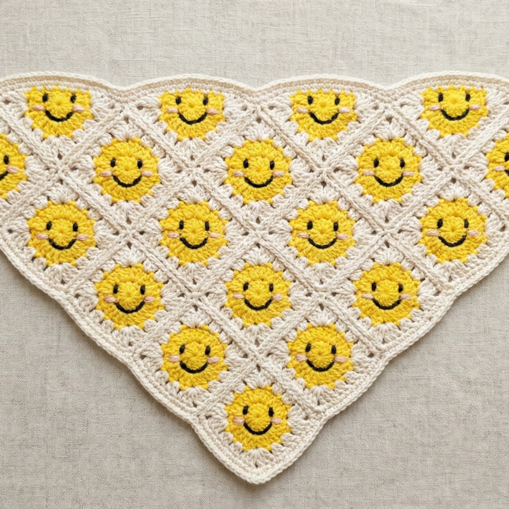 Vibe: Playful, youthful — tiny smiley face motifs worked into a triangular bandana using tapestry single crochet or appliqué.