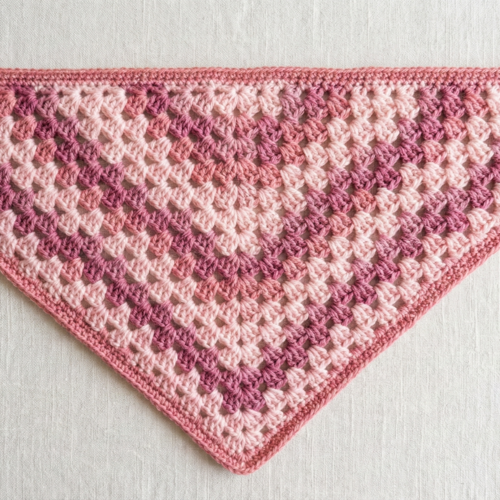 Assemble a triangular bandana by using a set number of half granny squares and quarter granny motifs arranged into a triangle (or make an actual triangle of granny clusters). Because user requested only pink shades, pick 3–4 pink values and alternate.