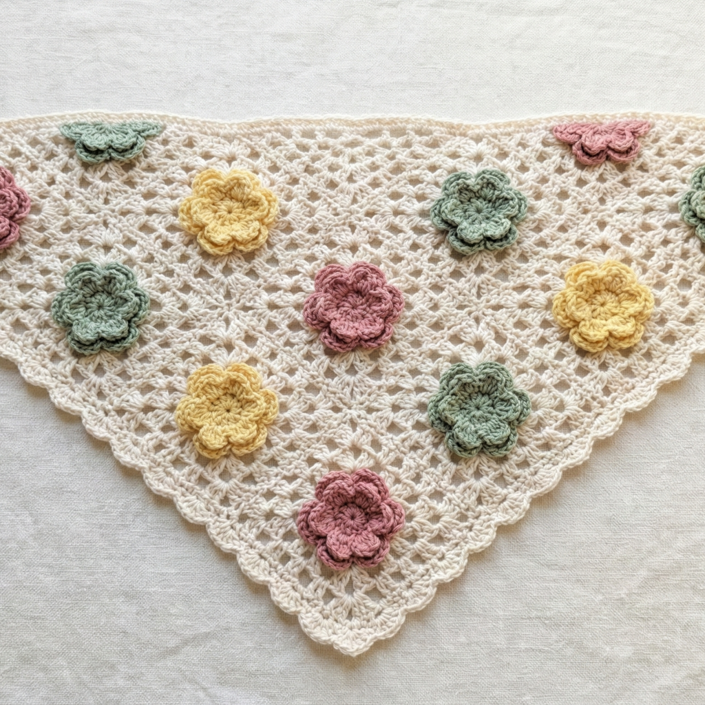 Work triangular bandana in a repeating lace chart such as shell-and-chain or filet patterns to create open, floral-looking motifs. Use consistent stitch tension and block carefully to open the lace.