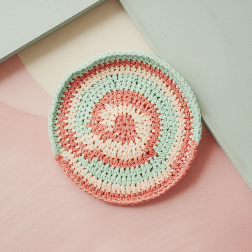 - When the coaster reaches desired diameter, finish with a round of crab stitch or reverse single crochet for a tidy twisted edge. Fasten off and weave in ends.