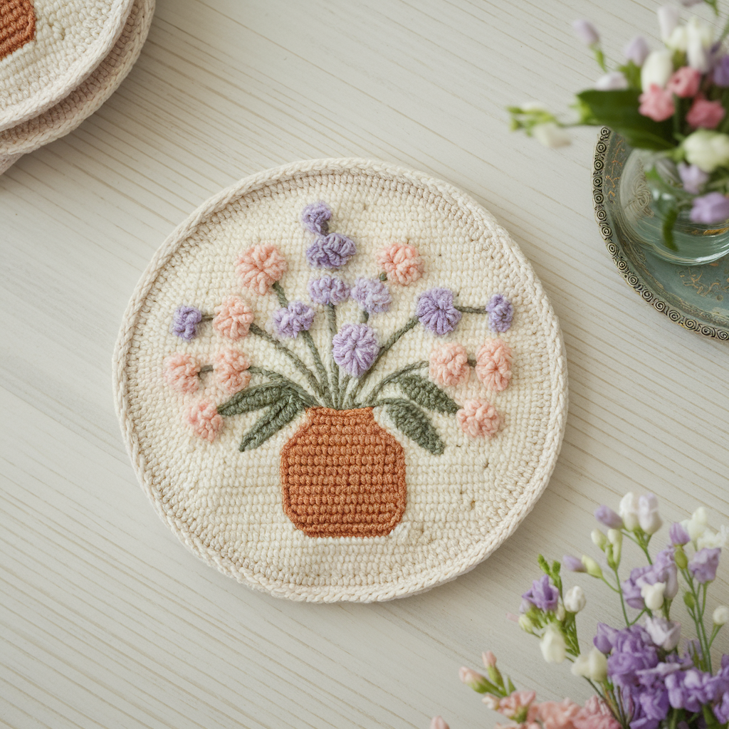 - Option B — appliqué method: crochet a plain round base in a neutral color. Separately make tiny flower motifs (tiny circles or 5-petal shapes) and small straight stems (tiny chains sewn down) and stitch them to the base in bouquet arrangement.