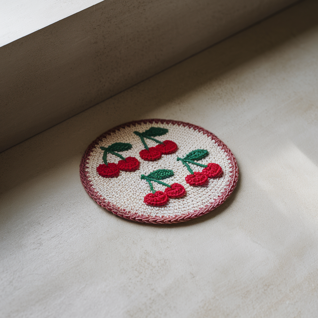 - Position cherries on the coaster: arrange as a neat border around the edge, or scatter in 3-4 clusters across the surface. Sew cherries on securely at the bases, hiding stitches under petals or the base so they don’t snag glass bottoms.