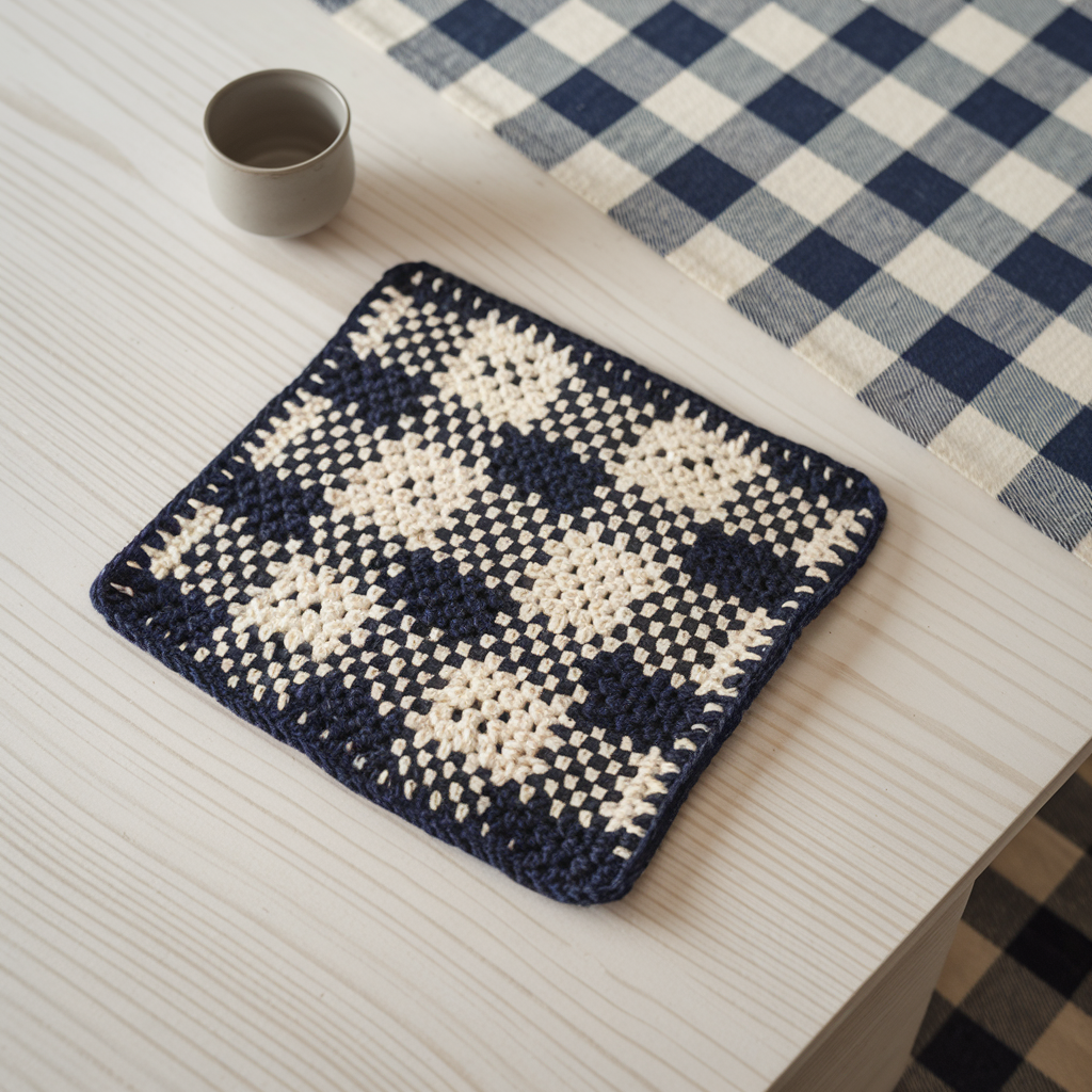 Graphic and homey, the gingham coaster uses tapestry or tapestry-like crochet colorwork to create the checked pattern reminiscent of classic gingham tablecloths. It’s bold, modern, and perfect for farmhouse or retro kitchens.