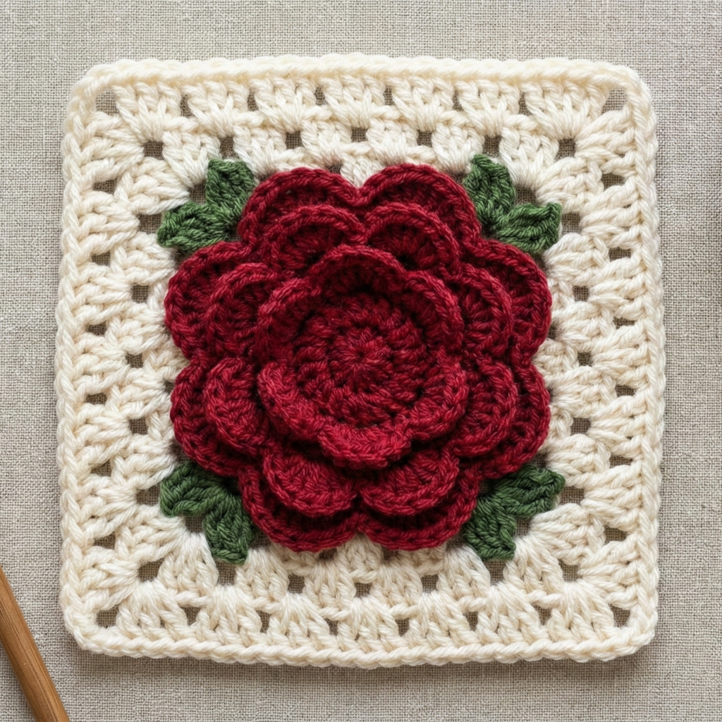 - The rose is often an appliqué made separately and sewn into the center, or worked as an overlay using layered puff stitches. The surrounding square uses classic granny rounds to frame the flower.