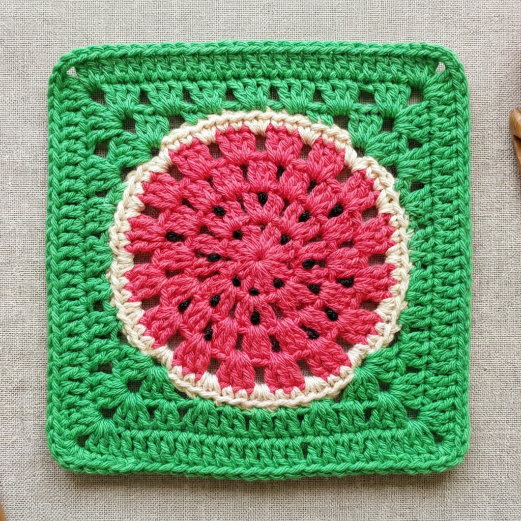 - This pattern layers colors round by round to mimic a watermelon cross-section; seeds are small embroidered spots or French knots after the square is complete.