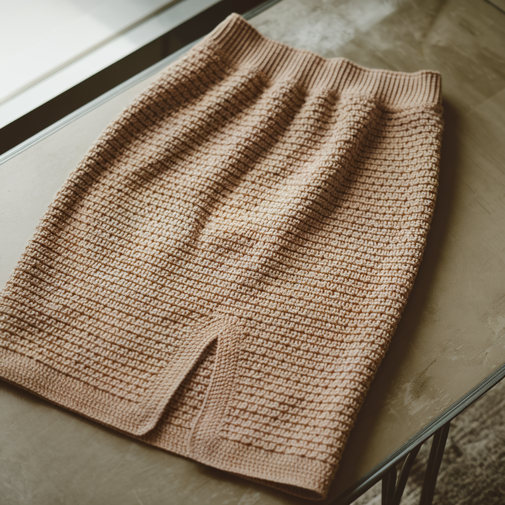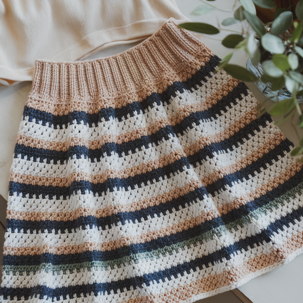 Inspired by beach textures — the Sandy skirt uses textured stitches (seed stitch, linen stitch, or knot stitch) and lighter yarn for a casual, summery mini.