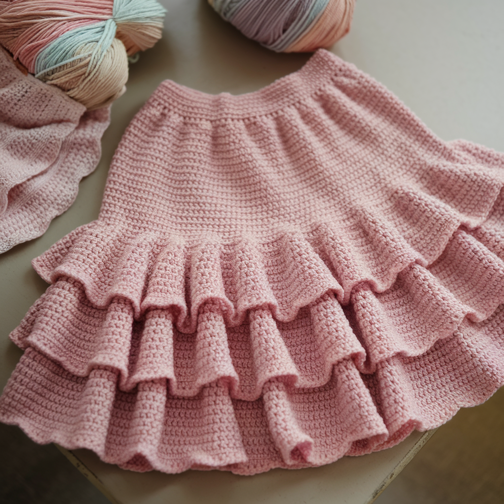 Materials: Sport or DK yarn for soft drape, 600–1000 yds (depends on tier fullness), 3.5–4.5 mm hook, elastic for waist, lining optional.