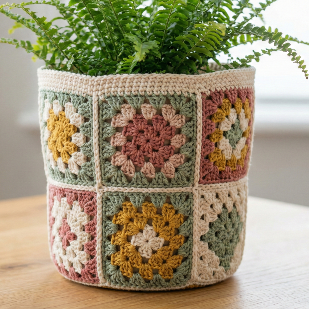 - Scale easily — increase base rounds for larger pots, or add more granny squares to widen a panel.