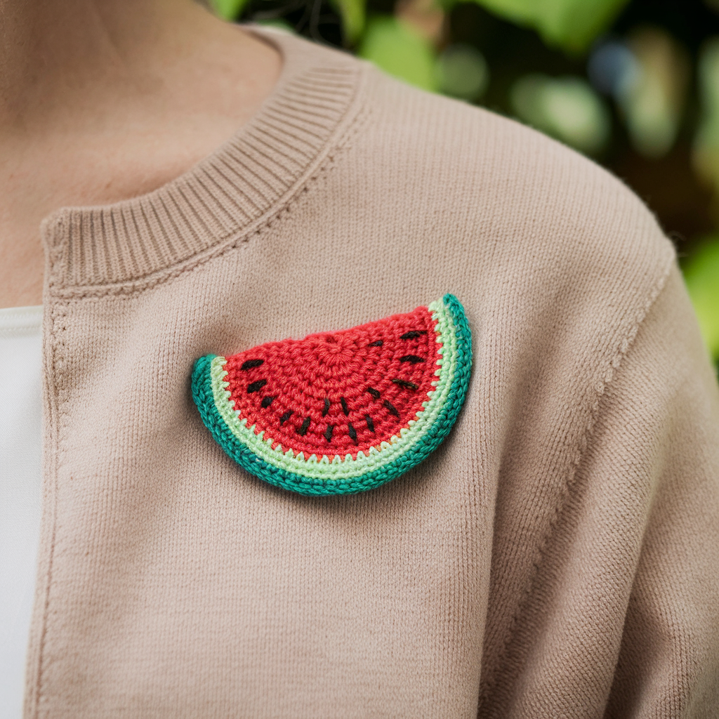 Crochet a semi-circular wedge worked in increasing rows (flat) with color changes for rind and flesh; add seeds, a tiny green stem or leaf, then back with felt and attach pin.