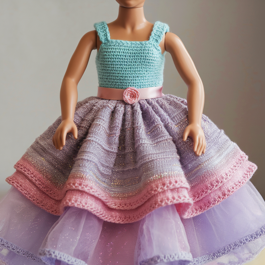 - Skirt: join to lower edge and work multiple rounds with increases for fullness; optionally attach tulle underskirt.