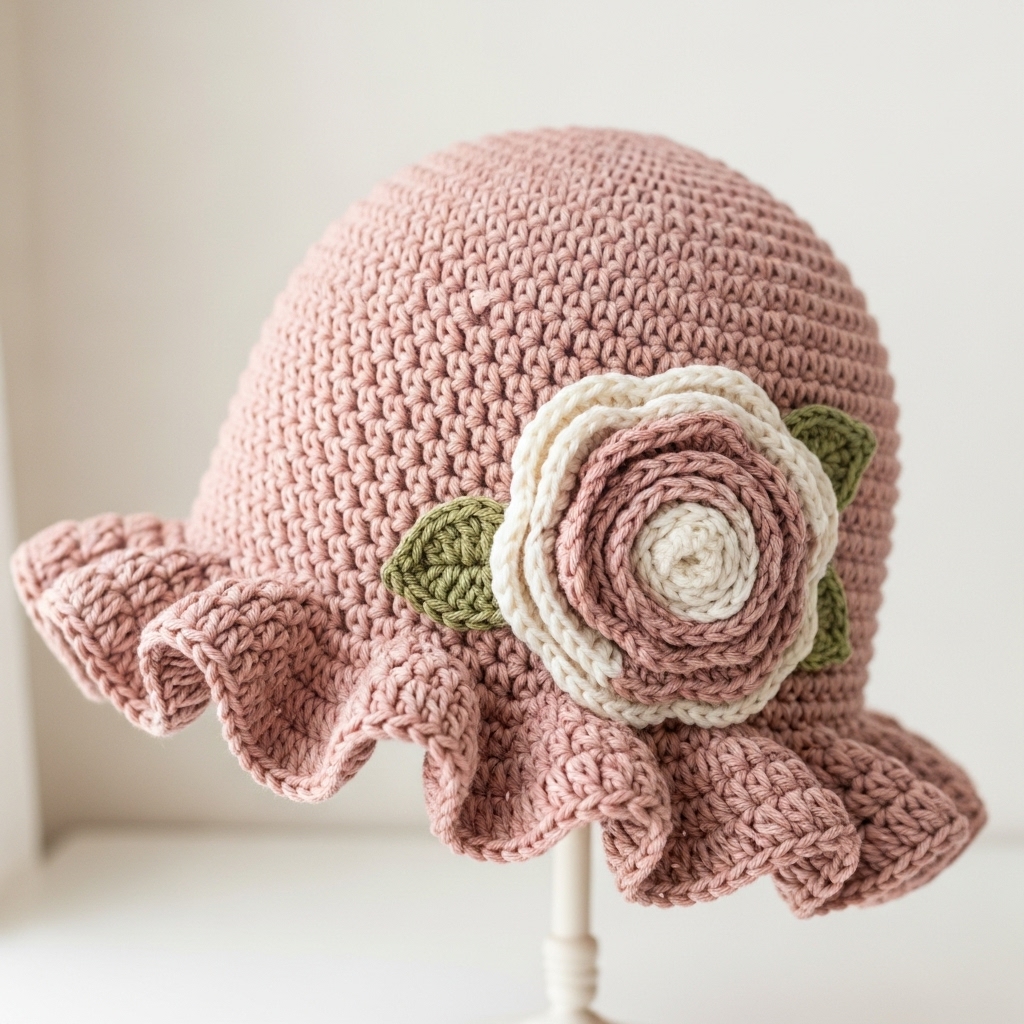 - Make a long crochet strip (for a flat spiral rose): ch 60 (adjust for desired rose size). Row 1: sc across. Row 2: sc 1, hdc 1, dc 3, hdc 1, sc 1 repeat to form petal segments. Fasten off, leave long tail; roll strip from one end, sew the underside as you curl to secure the rose. Attach rose to side of hat with stitching and hide ends inside hat. Add a small leaf or two if desired.