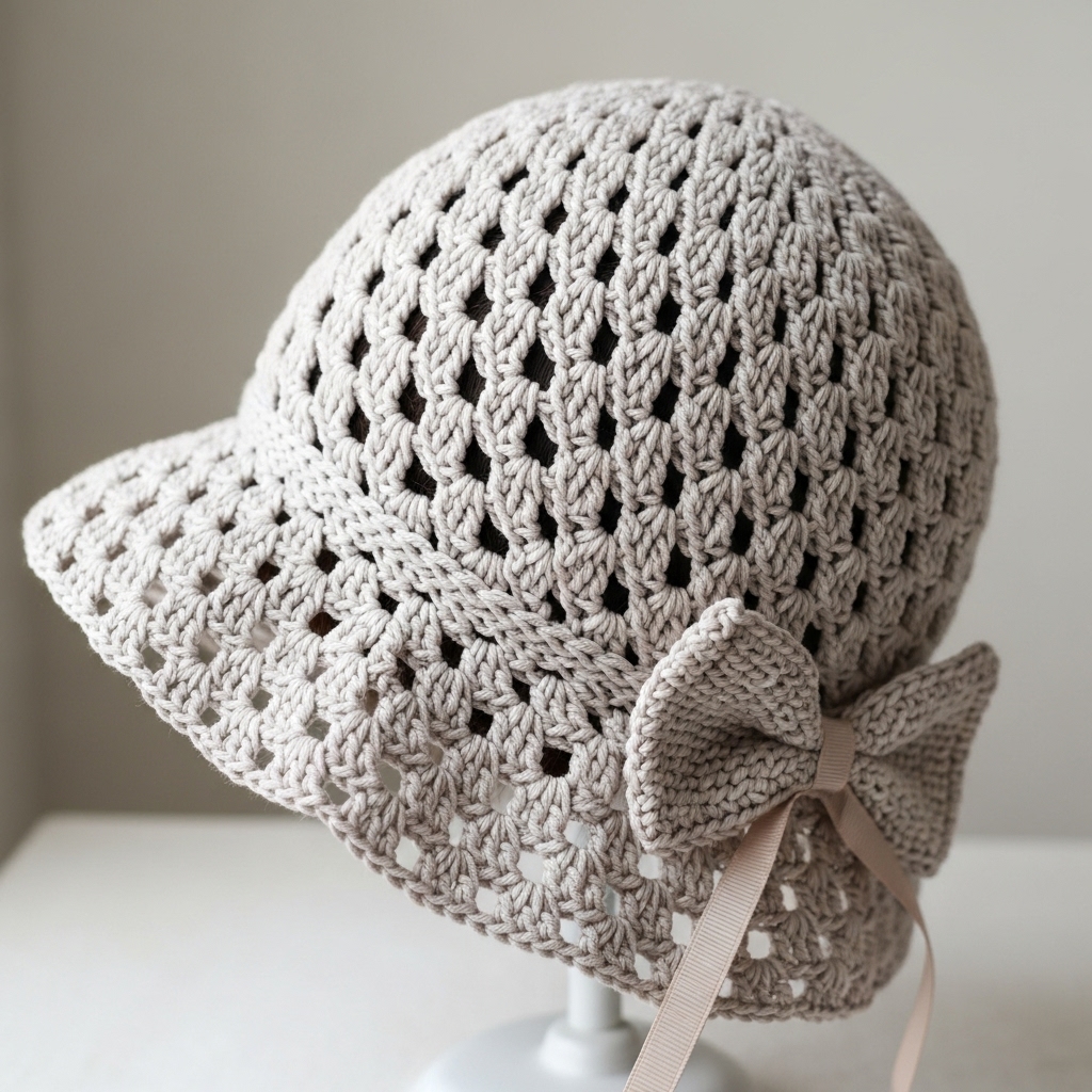 - Use V-stitch (dc, ch1, dc) repeats for texture. Work crown increases and a gently flared brim. Make a separate bow strip and attach.