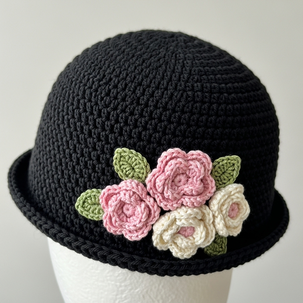 - 100% cotton worsted yarn in black for main hat; 1–2 small contrast skeins for flowers (pink, cream, green).