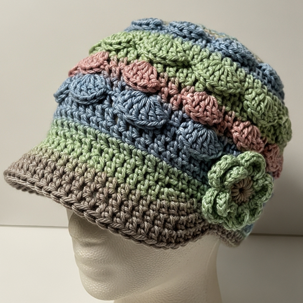 Style: Sporty hat inspired by granny-stitch texture, but shaped like a baseball cap (soft brim and rounded crown) — a playful hybrid between classic granny square texture and a casual cap silhouette.