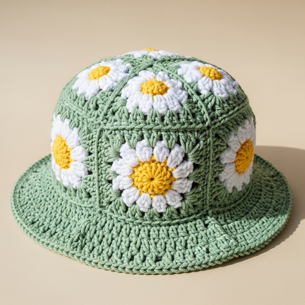 - Similar crown and body to standard bucket hat; daisies are small appliqués attached around the crown or grouped on one side.