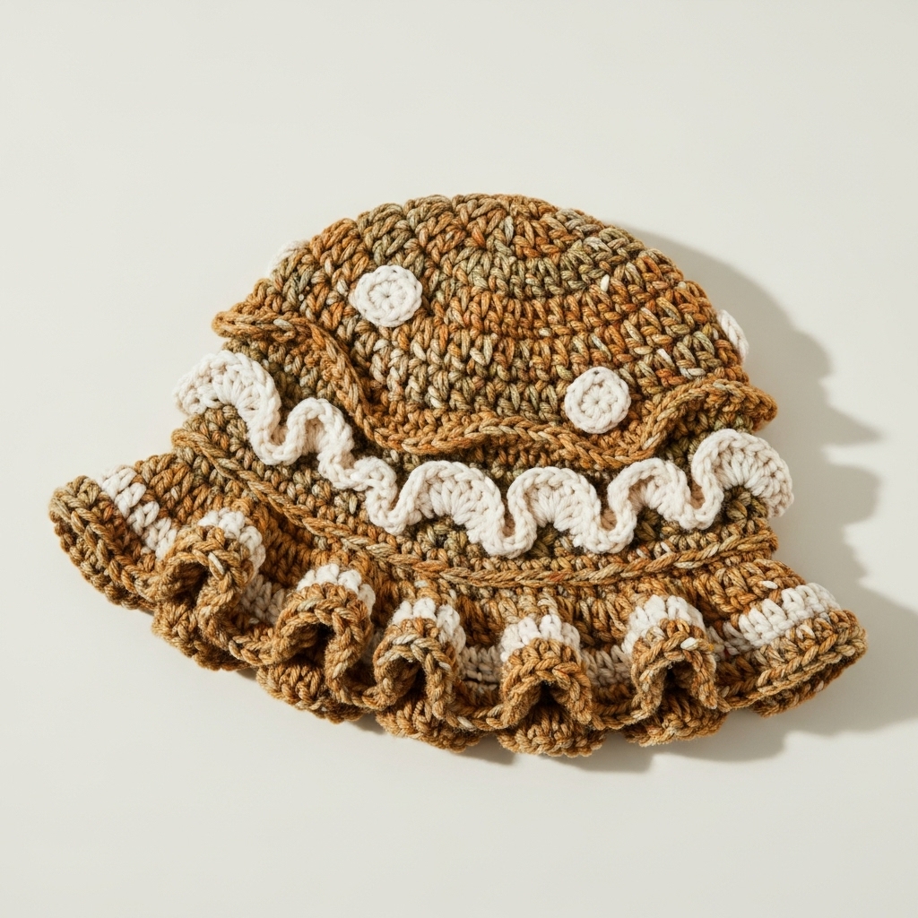 Style: Whimsical bucket hat with a soft, mushroom-like ruffle or undulating brim; use variegated or tweedy yarn for an organic look.