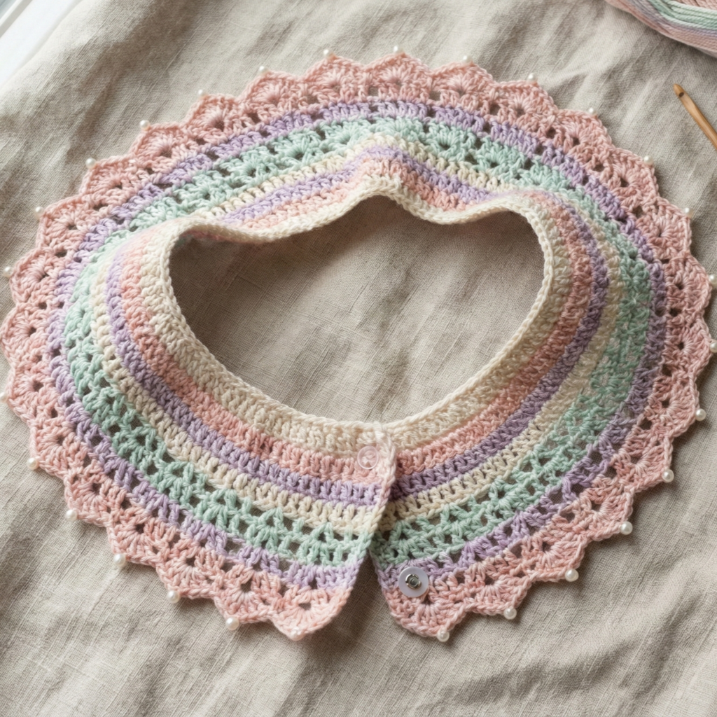 Bright, summery collar with watermelon stripe base and tiny seed embroidery — cheerful and easy to adapt.