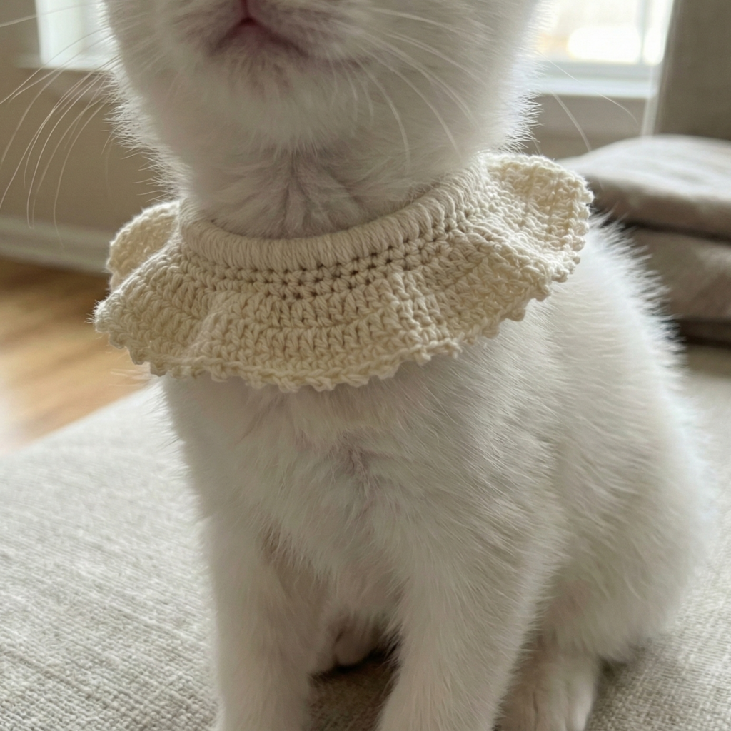 Work a snug inner band (fitted to pet neck) and then attach 1–3 tiers of ruffles worked in shell/stitch rounds. Make the ruffle detachable by making it a tube that slides over the plain collar, or attach with snaps.