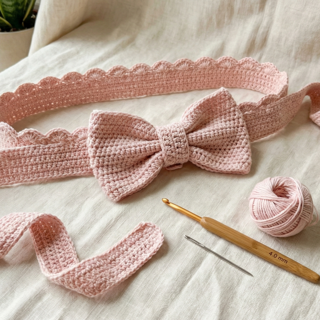 5. Bow body: ch 30 (adjust for desired fullness). Row 1: sc in 2nd ch and across; repeat 3–4 rows to make a rectangular strip. Pinch center and wrap a narrow band (make ch10, sc rounds to make a knot). Sew knot around center to form a bow. Sew a small snap (one half onto the bow back, the other half onto the overlay band) so you can snap the bow on/off. Or make a fabric loop on the bow that slides over collar.