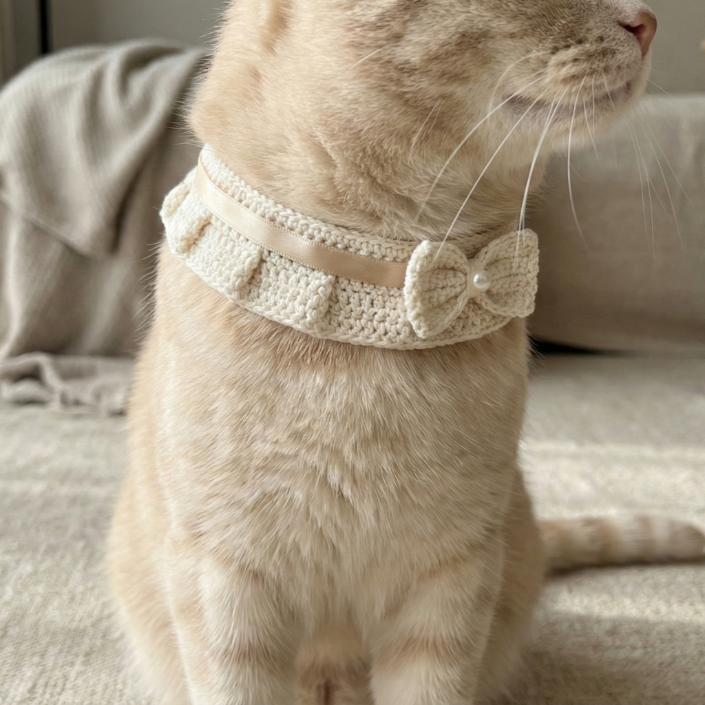 Make a crocheted overlay band sized to fit the pet, either as a fully crocheted collar (light duty) or crocheted over webbing (recommended for dogs). Make a large bow that attaches by snaps or a small loop so it’s removable.