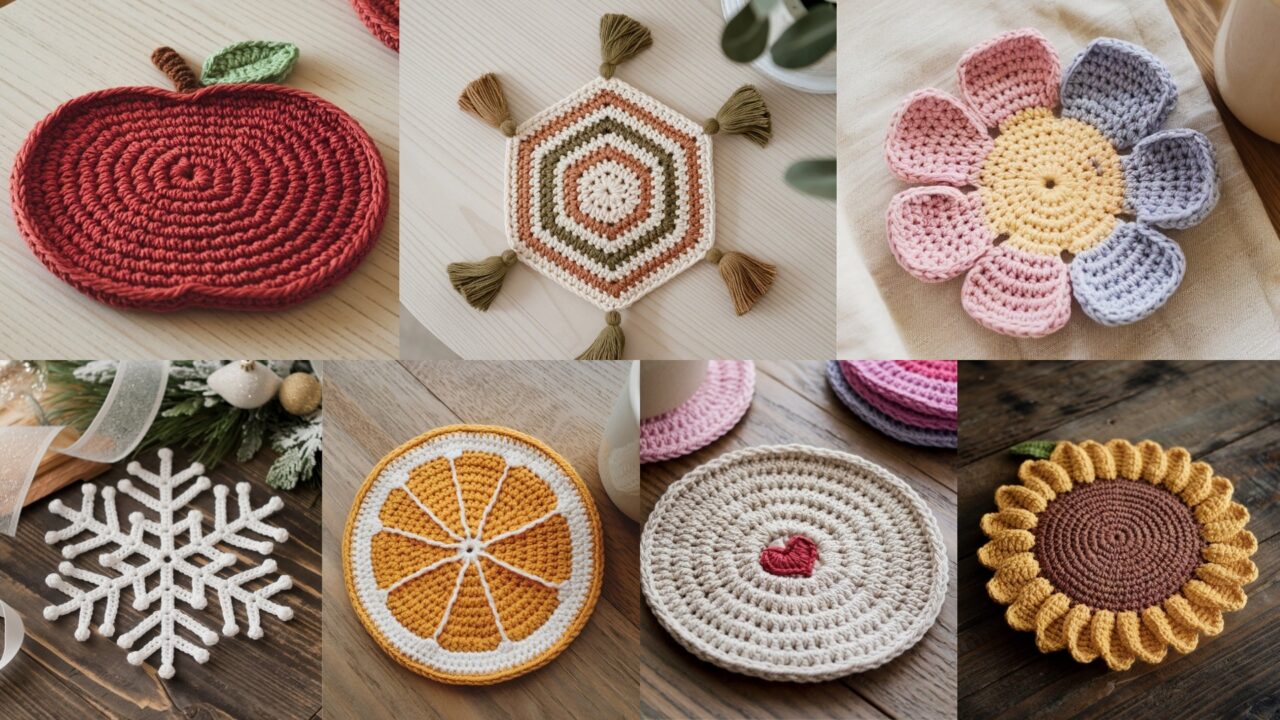 There you have seven distinct coaster patterns that suit seasonal decor and everyday use: a delicate snowflake for holiday tables, cheerful flower and sunflower motifs for spring and summer, a modern citrus slice for bright kitchens, a sweet heart motif for gifting, a playful apple for breakfast nooks, and a boho hexagon for effortless sets and modular projects.