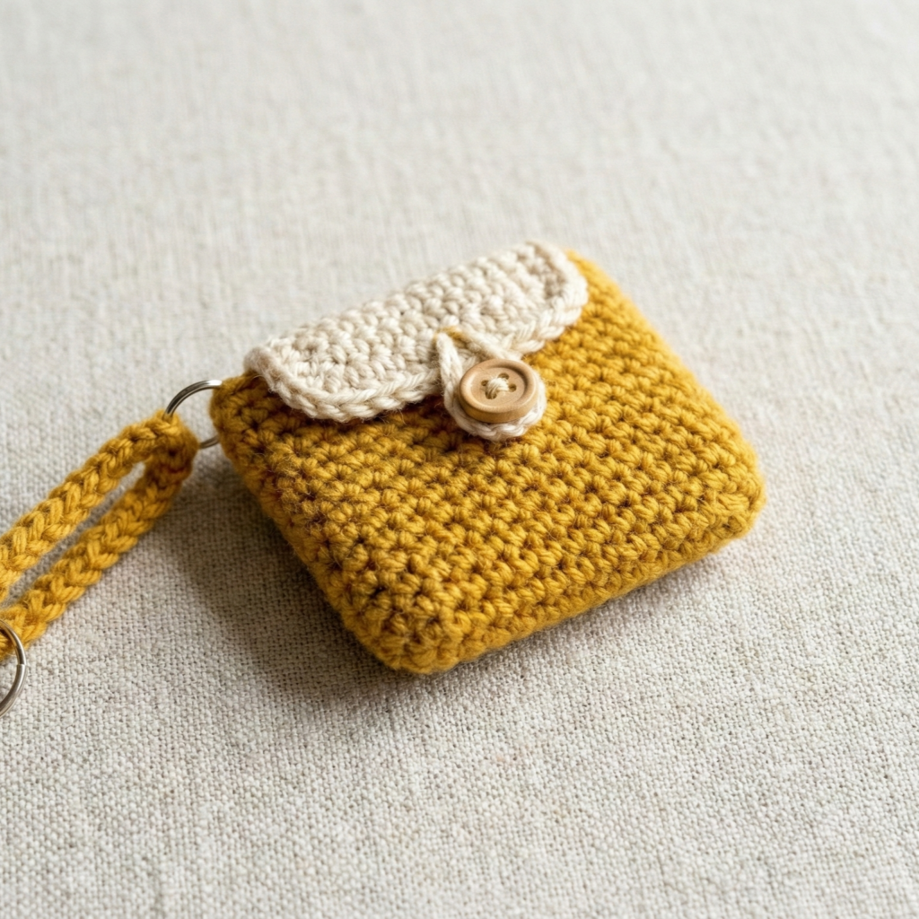 - Create a loop for the key ring by crocheting a small chain loop at the top seam (ch6, sl st to base), or securely sew a small metal jump ring into the top seam (stitch through the ring several times to secure). Attach key ring.