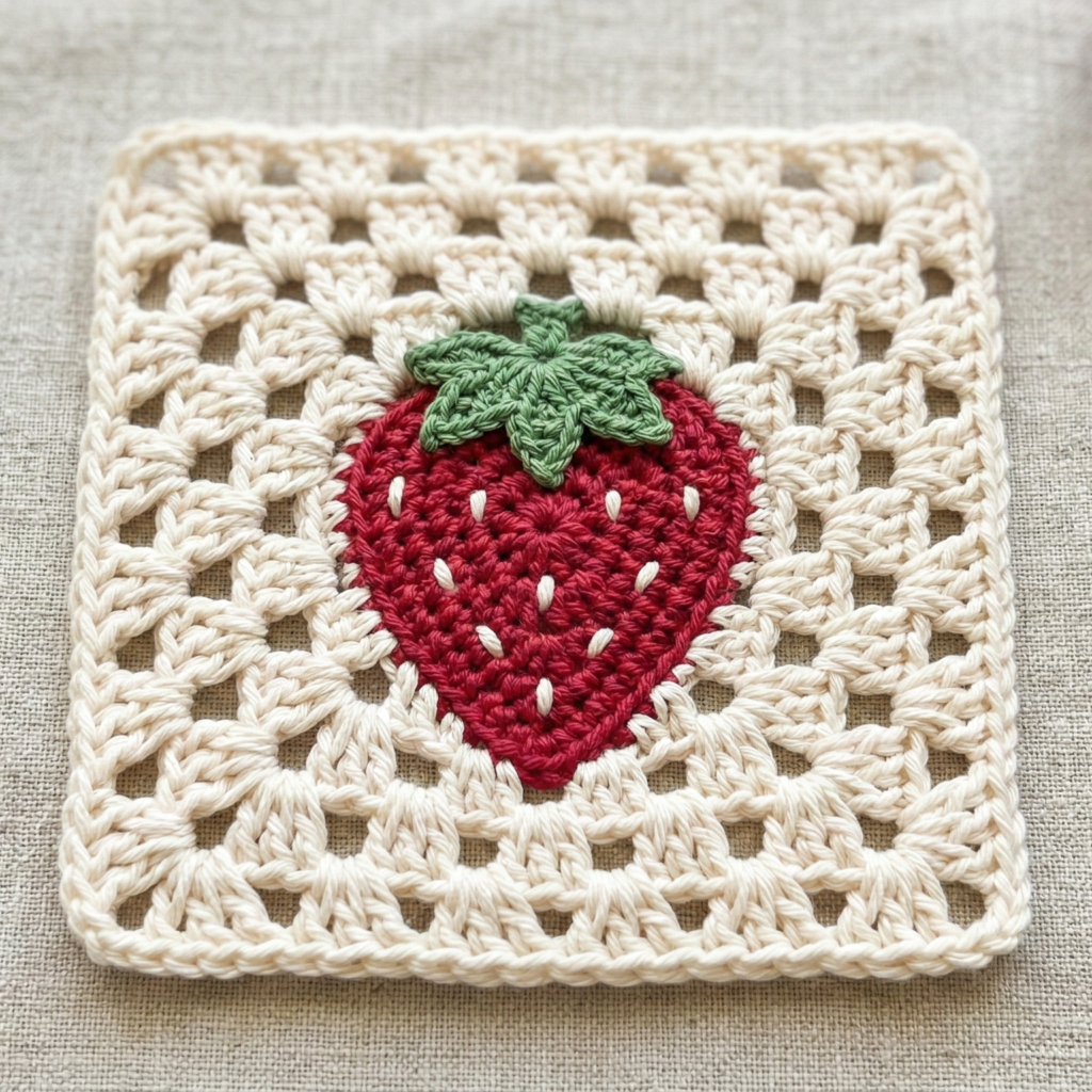 A cute motif featuring a tiny strawberry centered inside a granny square — great for kids’ projects and playful throws.