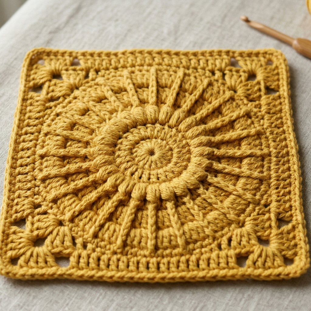 Work concentric rounds of textured stitches (puff, cluster, front/post) to create a sunburst that’s then squared by corner rounds.
