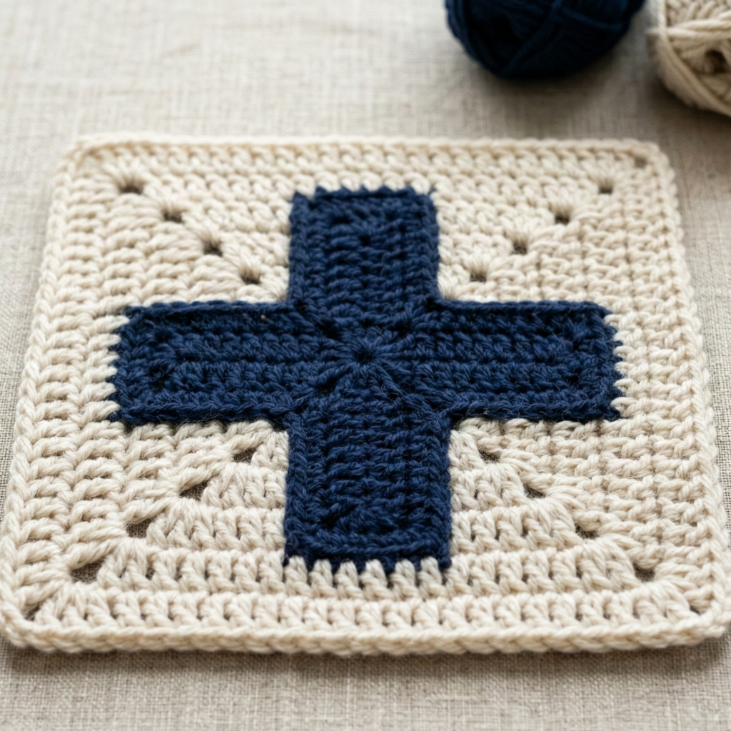 - Work a small 3×3 square of sc (chain 4, sc across 3, work 3 rows to get a 3×3 patch). Use color A for the central cross shape — leave corners empty. Then join into rounds around this patch with color B, filling in the corners to make a larger granny.